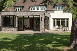 The original house has been uplifted; featuring replacement timber windows, restored lead dormers and a fresh coat of render whilst the contemporary brick extension stands in contrast to this. The design also features minimalist details and large glazed openings that flow out to the beautiful south facing garden. Our clients favoured the use of Crittall-style metal screens, doors and windows in the extension as a nod to the 1930’s heritage of the building. Internally, the metal screens provide regular visual structure around the open plan kitchen and sitting areas and provide framed views of both the garden and original house.