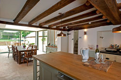 The existing kitchen had a monopitch extension which did not work well and created very low eaves so in order to create the new large family kitchen which was hoped for, this was removed to make way for a larger contemporay extension which could open up to an existing, small snug. Although sizeable and essential to create the large family space which embraces the garden, the new extension is very submissive and does not compete with the remainder of the existing house. The ‘service’ areas of the house adjacent to the kitchen were also rearranged to form a new boot / dog room, larder and family lavatory.